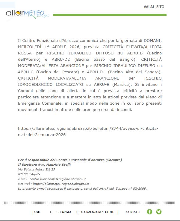 Il Centro Funzionale d’Abruzzo comunica che per la giornata di DOMANI, MERCOLEDÌ 1° APRILE 2026, prevista CRITICITÀ ELEVATA/ALLERTA ROSSA per RISCHIO IDRAULICO DIFFUSO su ABRU-B (Bacino dell'Aterno) e ABRU-D2 (Bacino basso del Sangro), CRITICITÀ MODERATA/ALLERTA ARANCIONE per RISCHIO IDRAULICO DIFFUSO su ABRU-C (Bacino del Pescara) e ABRU-D1 (Bacino Alto del Sangro), CRITICITÀ MODERATA/ALLRTA ARANCIONE per RISCHIO IDROGEOLOGICO LOCALIZZATO su ABRU-E (Marsica). Si invitano i Comuni delle zone di allerta in cui è prevista criticità a prestare particolare attenzione e a mettere in atto le azioni previste dal Piano di Emergenza Comunale, in special modo nelle zone in cui sono presenti movimenti franosi in atto e sulle aree percorse da incendi.